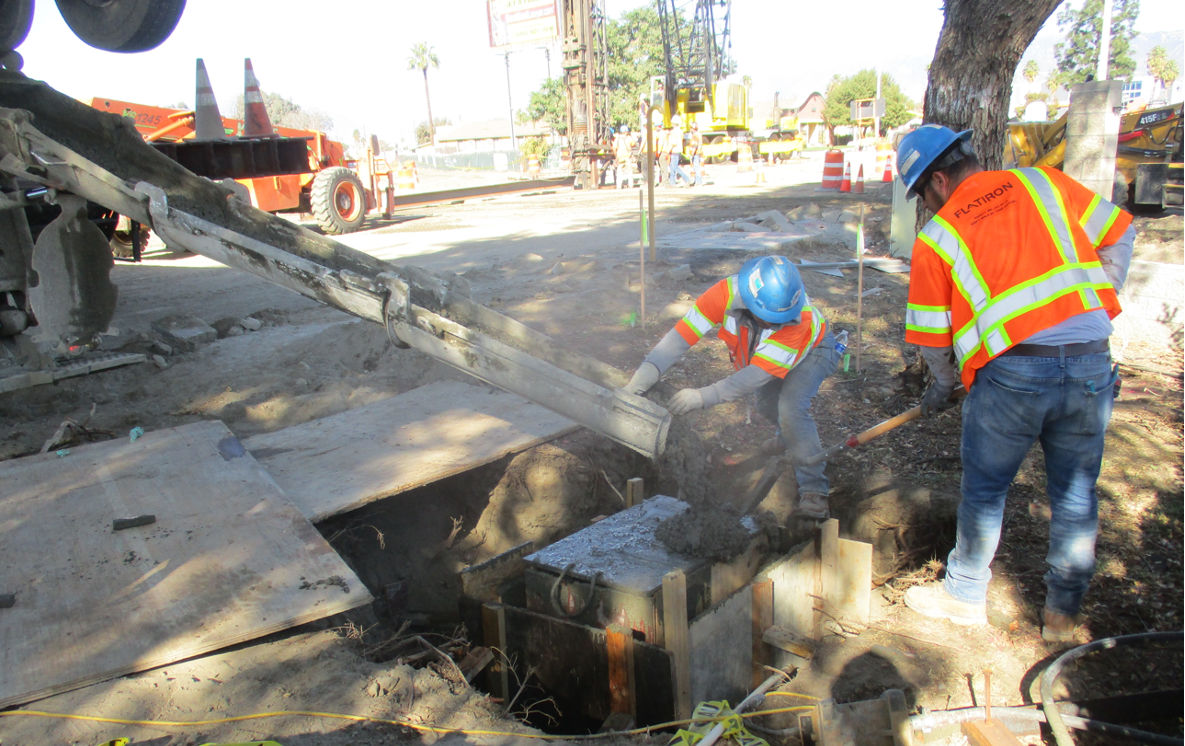 Construction workers pour concrete at the Waterman Avenue crossing of the upcoming hydrogen passenger rail project in San Bernadino, California.