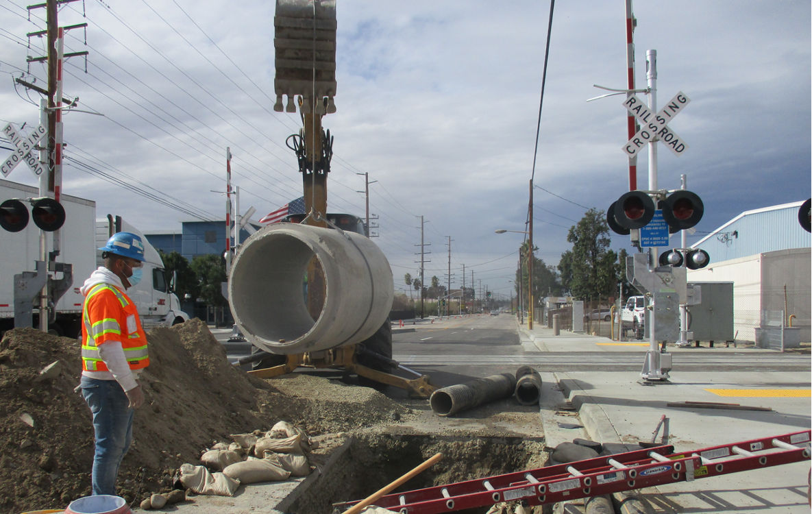 Crews install a drainage system at the Mill Street crossing of America’s first hydrogen powered rail project in San Bernadino, California. The project is over 90% complete according to information published by San Bernadino County Transportation Authority.