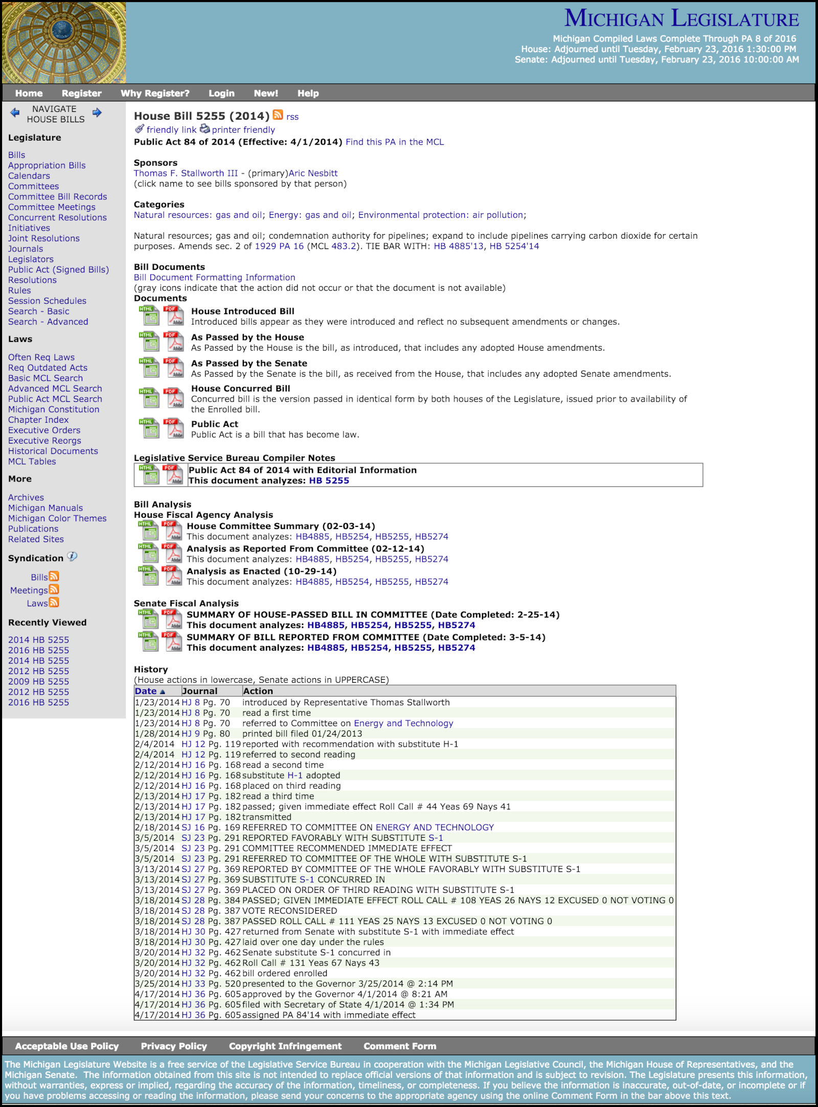 The screenshot below (see Fig. 3) shows bill HB 5255 of 2014 signed into law by Governor Snyder on April 1, 2014. Notice on this bill, which gives eminent domain rights to carbon dioxide (CO2) pipelines along with crude oil pipelines, that all the icons are lit up. You can see that this bill’s facebook style page is more mature with more information and has made it all the way into law. CO2 sequestration, clean energy production, Advanced Cleaner Energy Credits, and HB 5255 all go hand in hand. These are the types of bills and laws that RMP analyzes. In future posts, RMP will endeavor to analyze these bills and more to find they’re meaning. What bills interest you? Write them down and use these tools so you can analyze what’s important to you. Empower yourself.