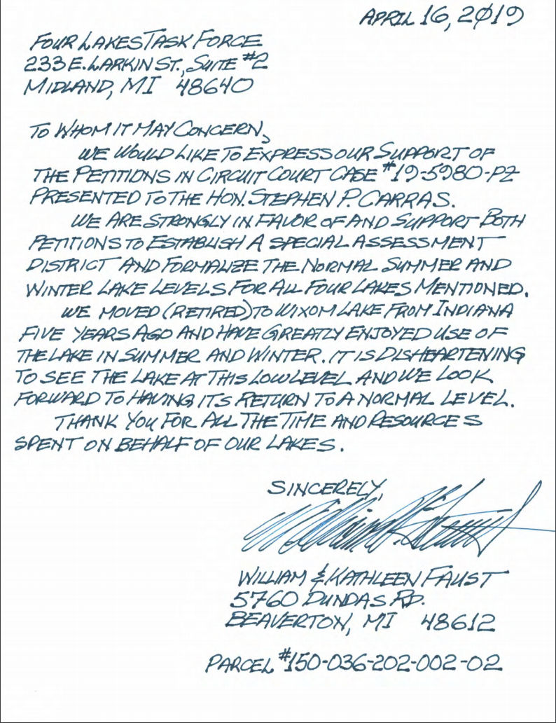 A term you will read again & again in the coming weeks will be the “legal level” of the lake that was set by Judge Stephen Carras when he signed the Lake Level Order under Part 307 of the Natural Resources and Environmental Protection Act, 1994 PA 451, as amended (MCL 324.30701 et seq) (“Part 307”). Judge Carras’ signature established normal or legal lake levels for Wixom, Sanford, Smallwood and Secord Lakes (“Four Lakes”). The Four Lakes Special Assessment District (SAD) recognized the authority of FLTF as the County Delegated Authority, to acquire, repair and then operate the four dams on behalf of Midland and Gladwin counties. The “normal levels” of the lake were provided in The Four Lakes Lake Level Study published by the Spicer Group commissioned by the FLTF. Dana Nessel, Michigan’s Attorney General, has already referenced the “legal level” on her twitter account stating officially “The State did not set the water level for Wixom Lake, a court did”. She also goes on to say the purpose of EGLE & DNR’s lawsuit is not to raise water levels but it “seeks damages for the past illegal lowering of the lake” in 2018 & 2019 that killed mussels.